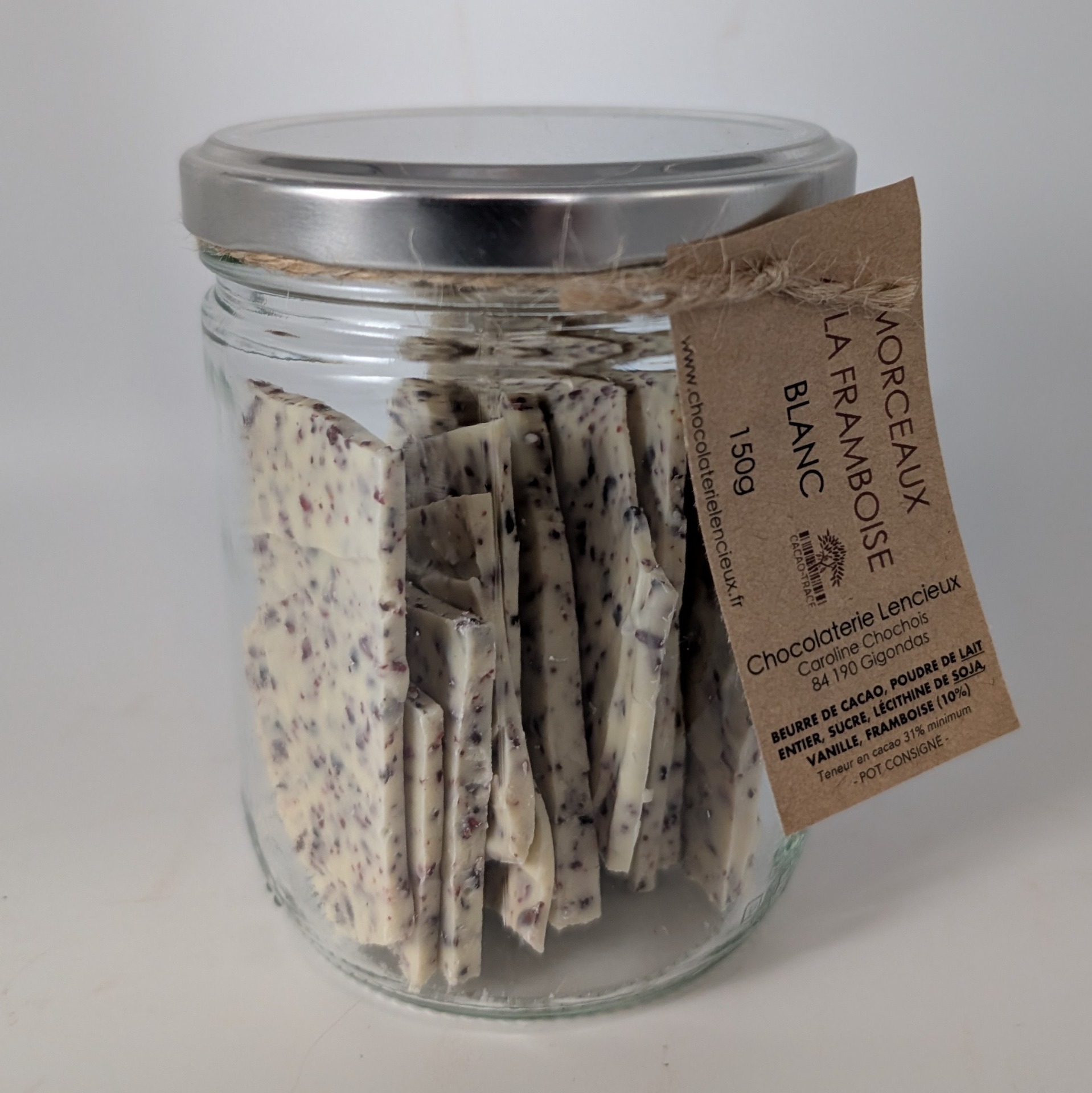 Description : morceaux de chocolat à la casse blanc avec des inclusions de framboise