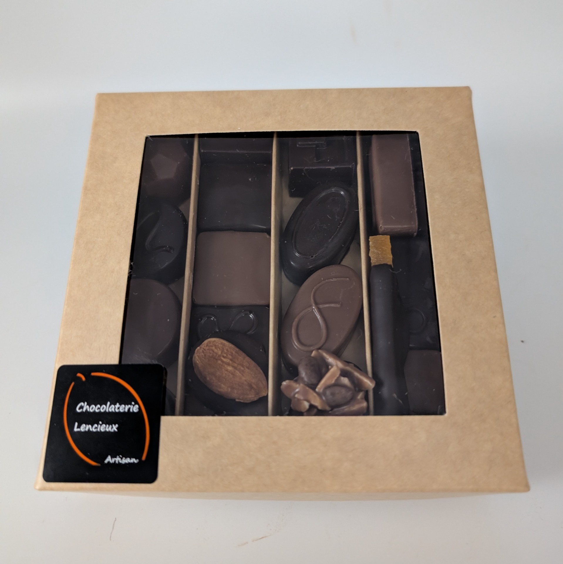 Ingrédients : masse de cacao, beurre de cacao, sucre, lécithine de soja, vanille naturelle, sucres, crème, beurre, sorbitol, alcool, noisettes, amandes, pistaches, noix, cacahuètes, framboise, citron, orange, mandarine, cassis, raisins, gingembre, fenouil, menthe, fève de Tonka, fleur de sel, riz soufflé