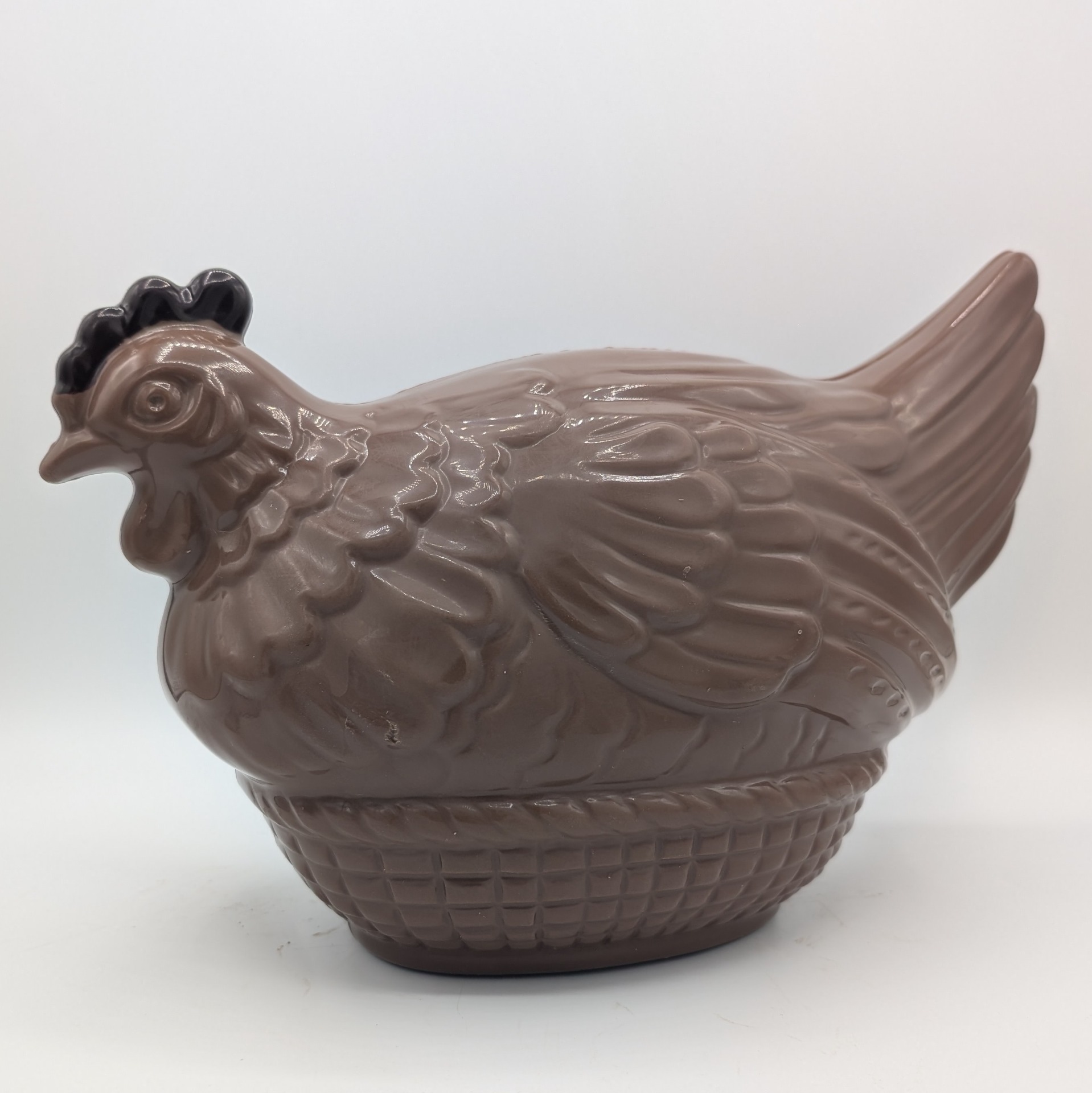 Description : sujet de chocolat brut en forme de poule, rempli de friture de la même couleur