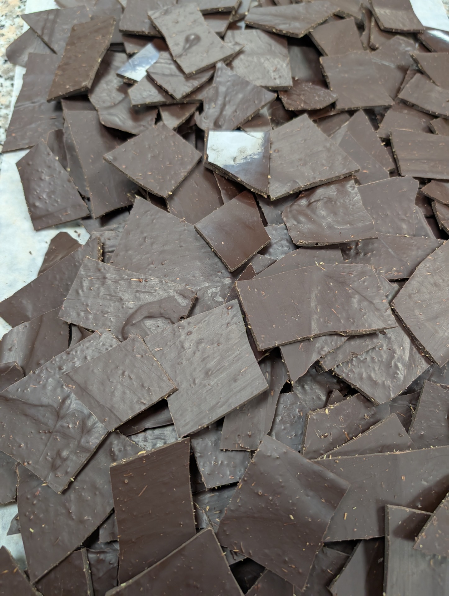 Description : morceaux de chocolat à la casse noir avec des inclusions de thym