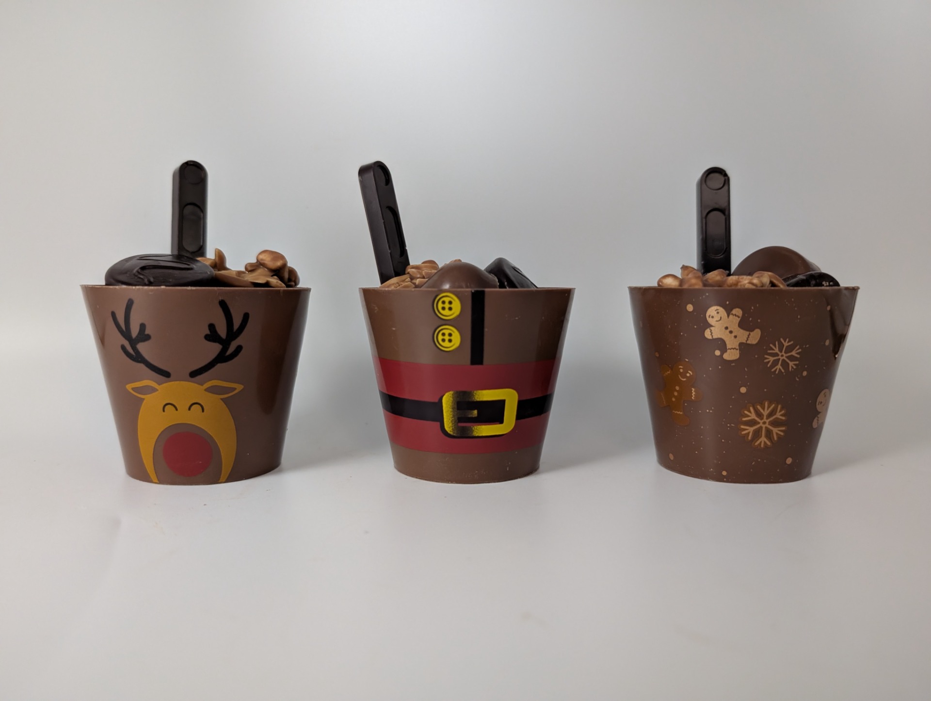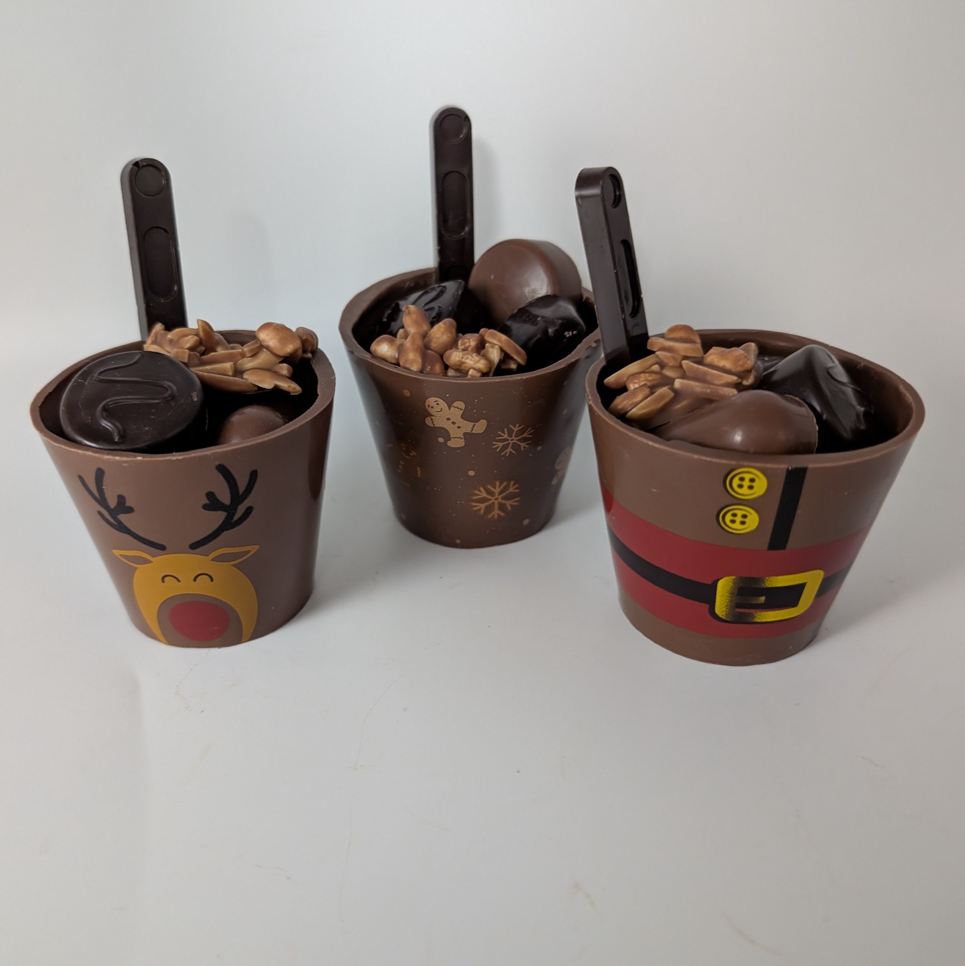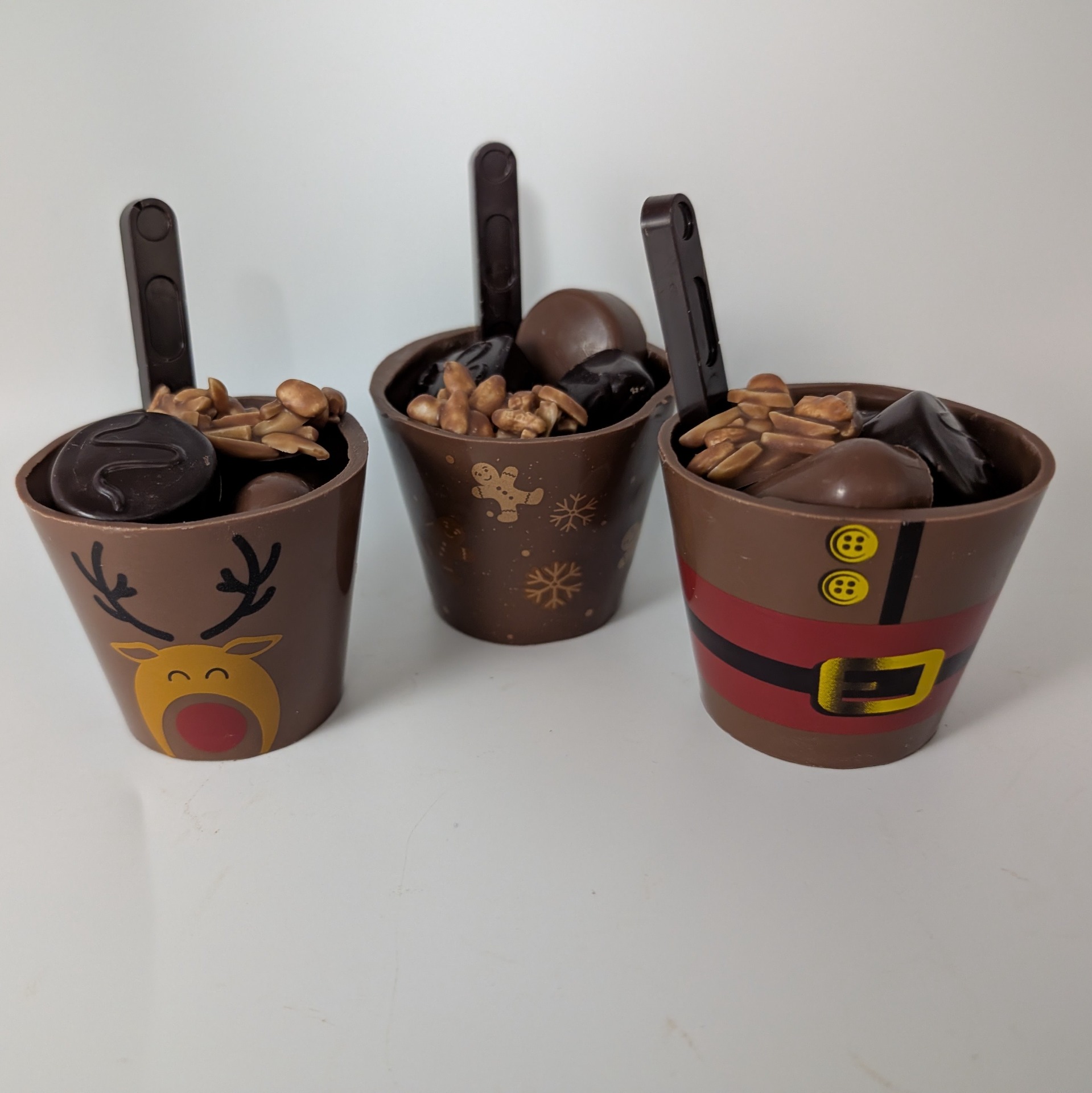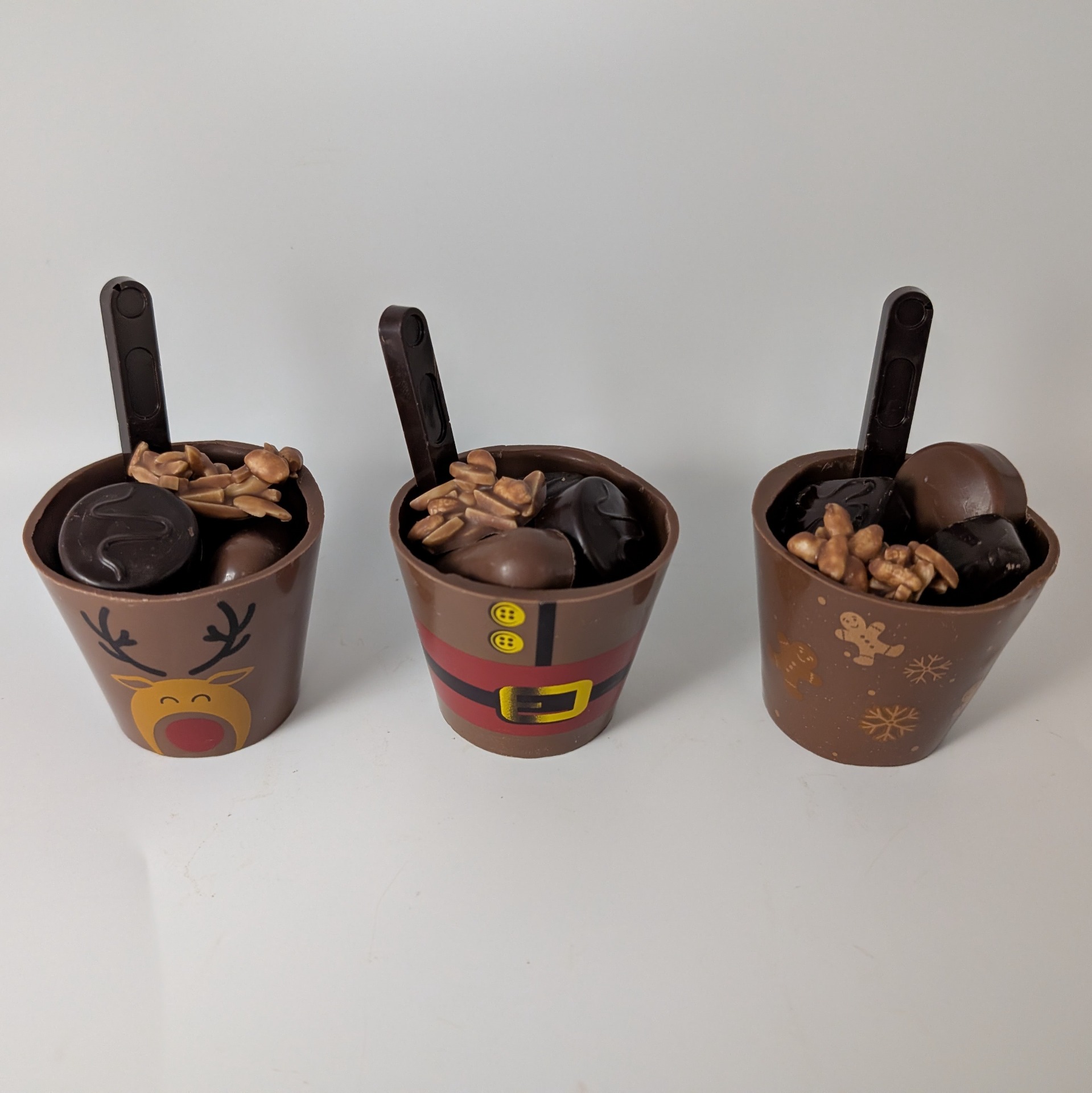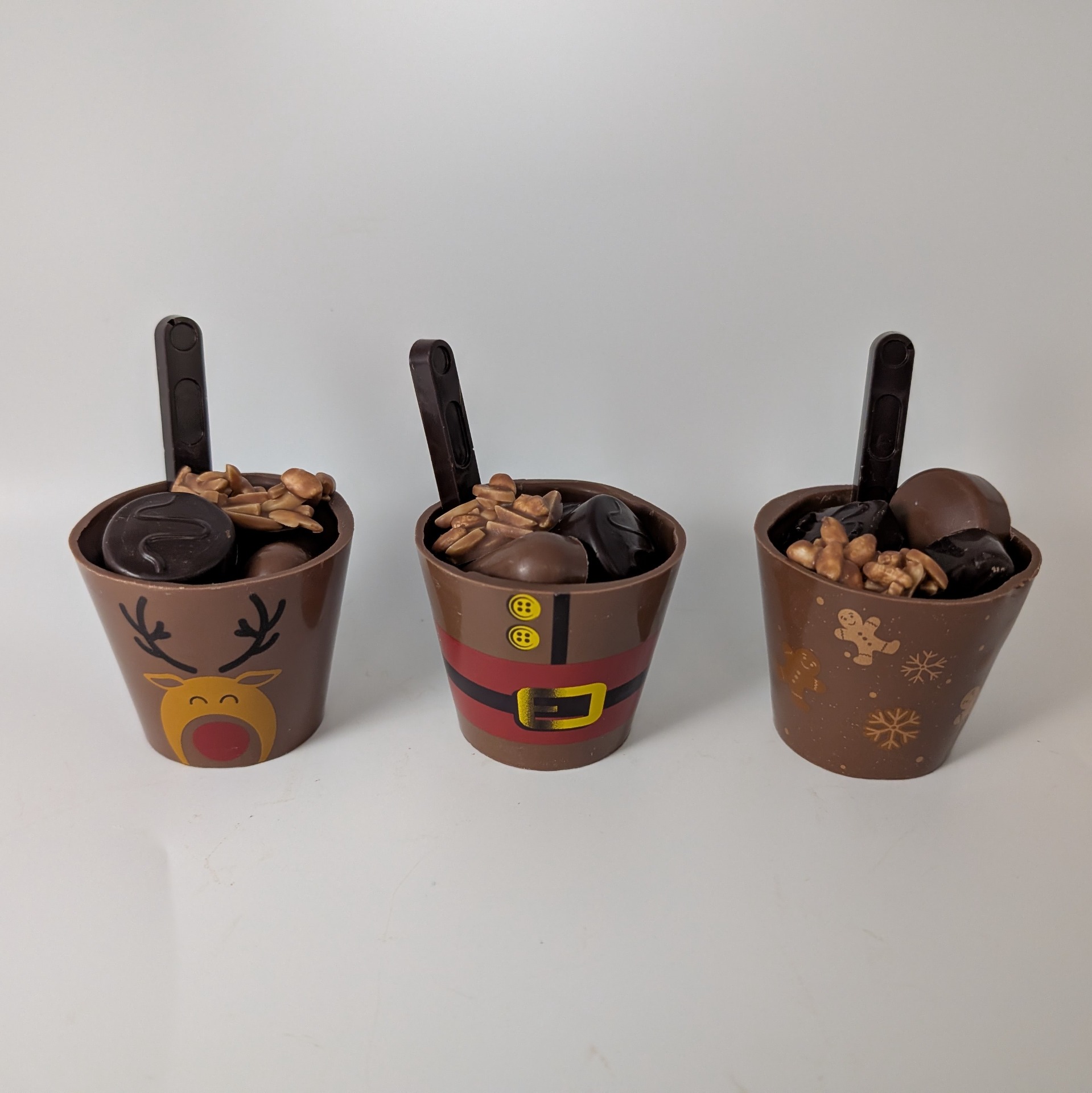 Description : tasse de chocolat lait 35% garnie de chocolats fourrés de la collection