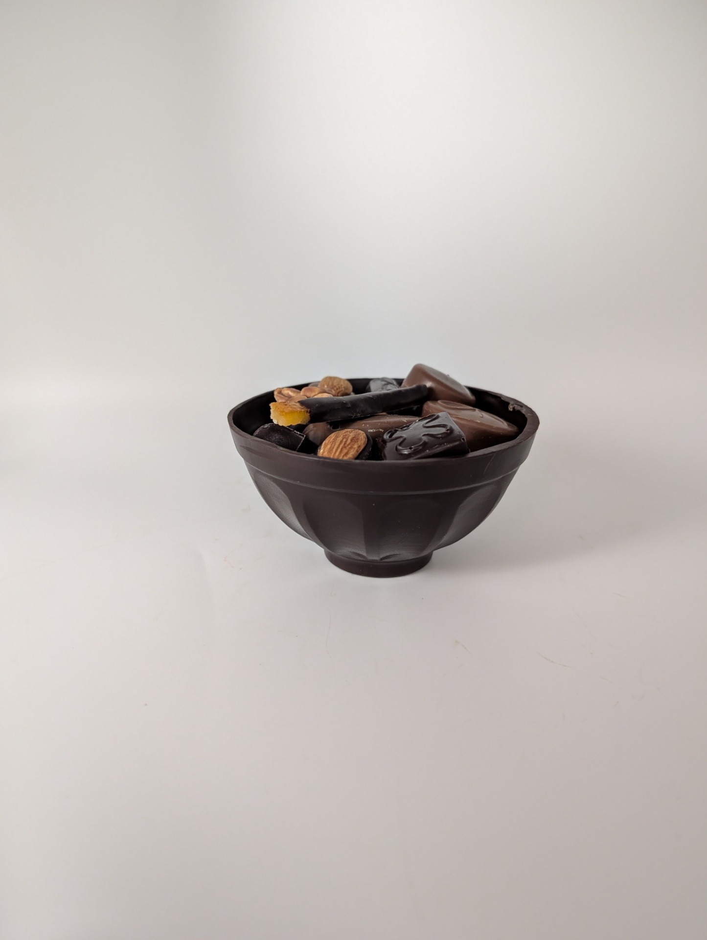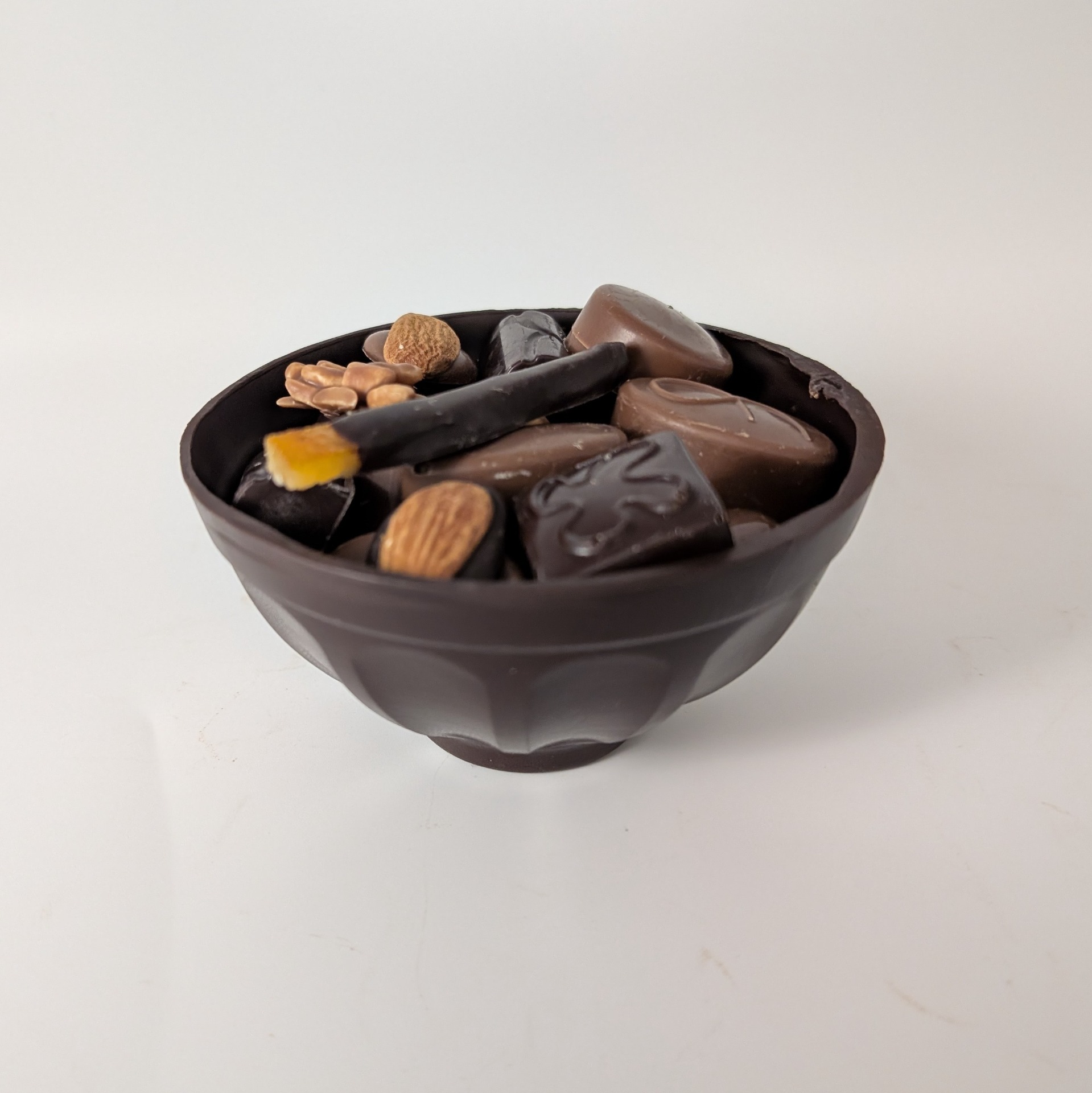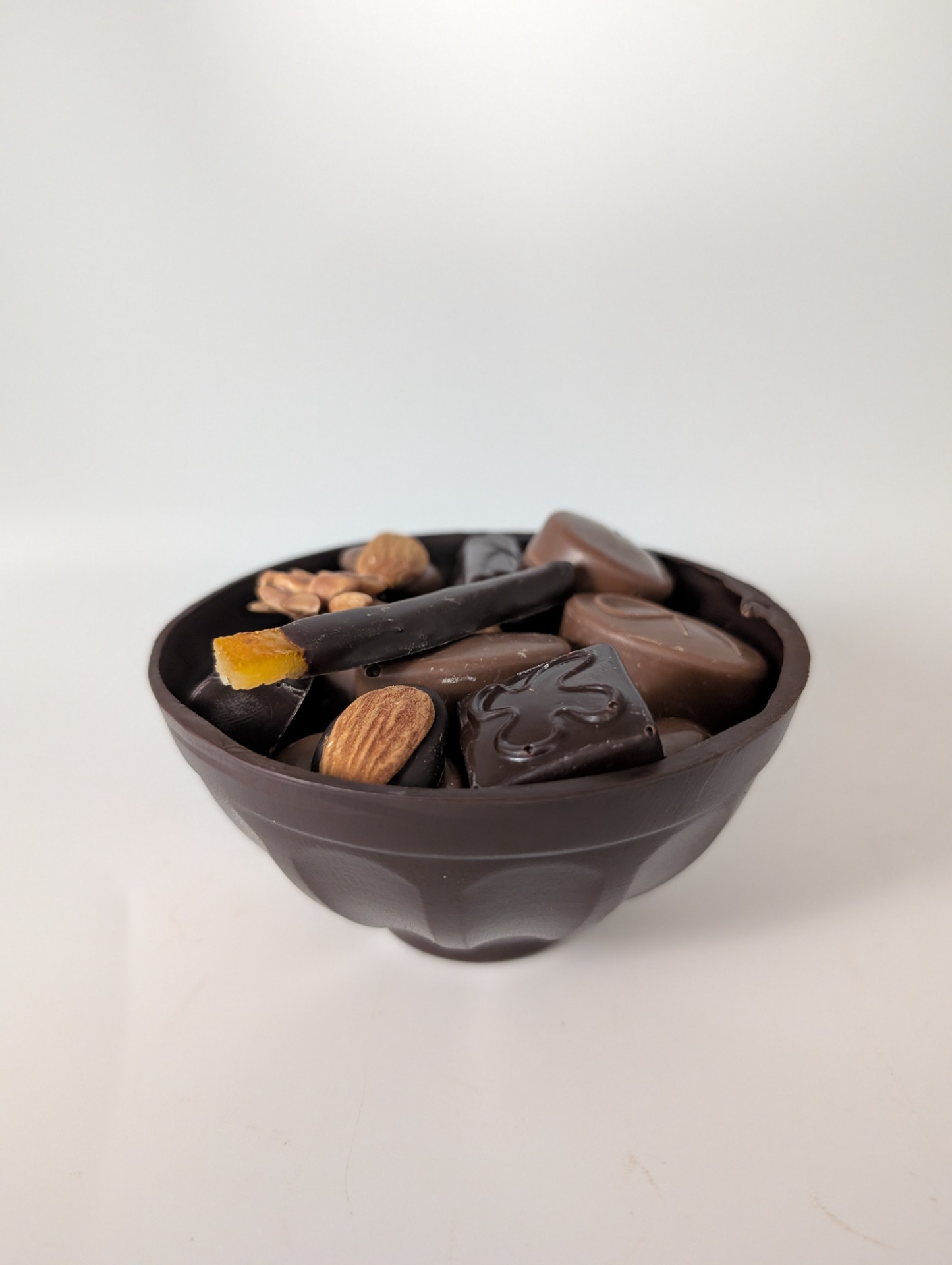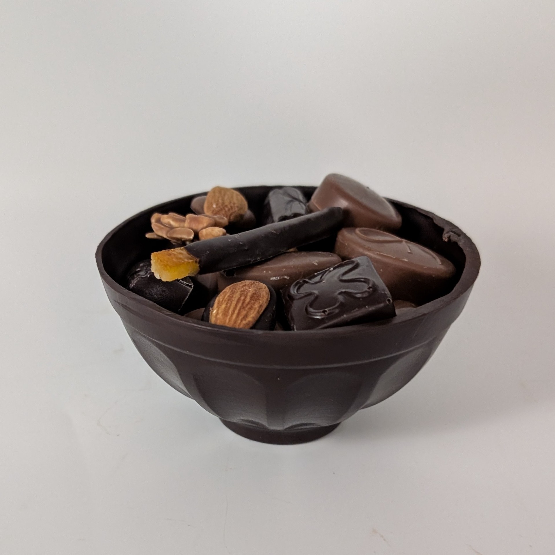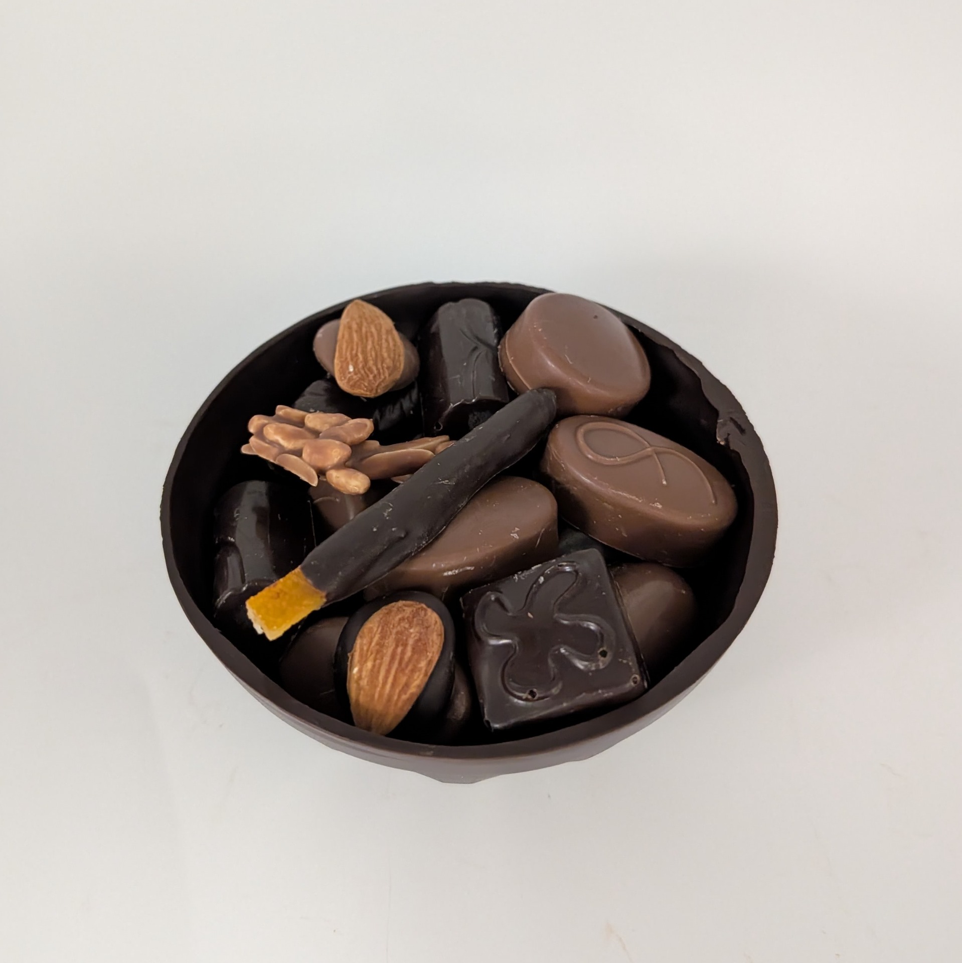 Description : bol en chocolat noir 70,5% garni d'un assortiment de chocolats fourrés de la collection