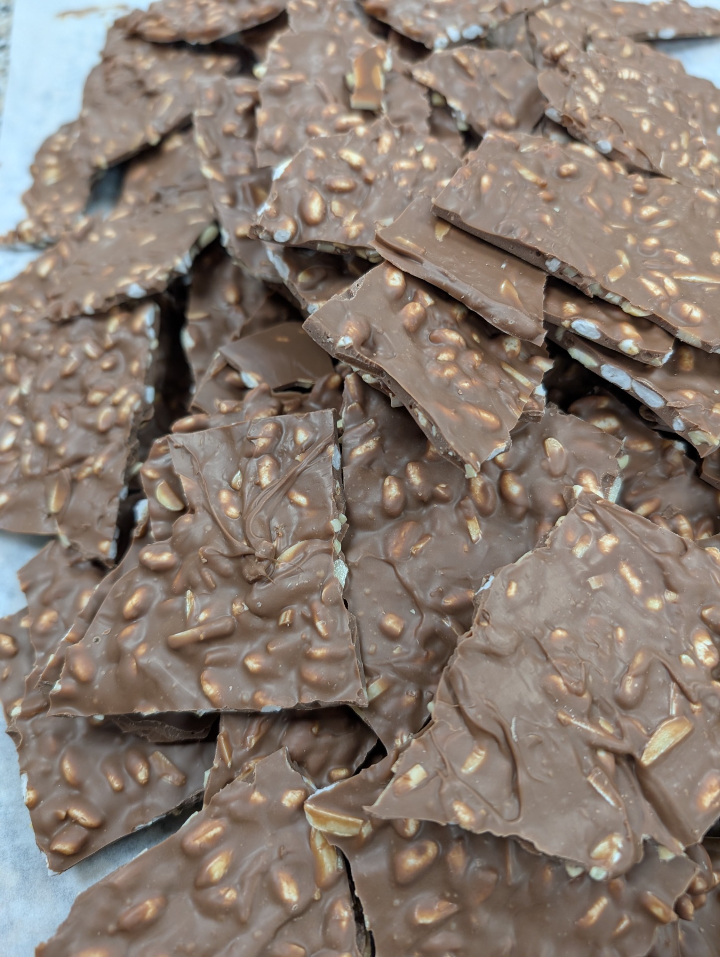 Description : morceaux de chocolat à la casse lait avec des inclusions d'amandes et de riz soufflé