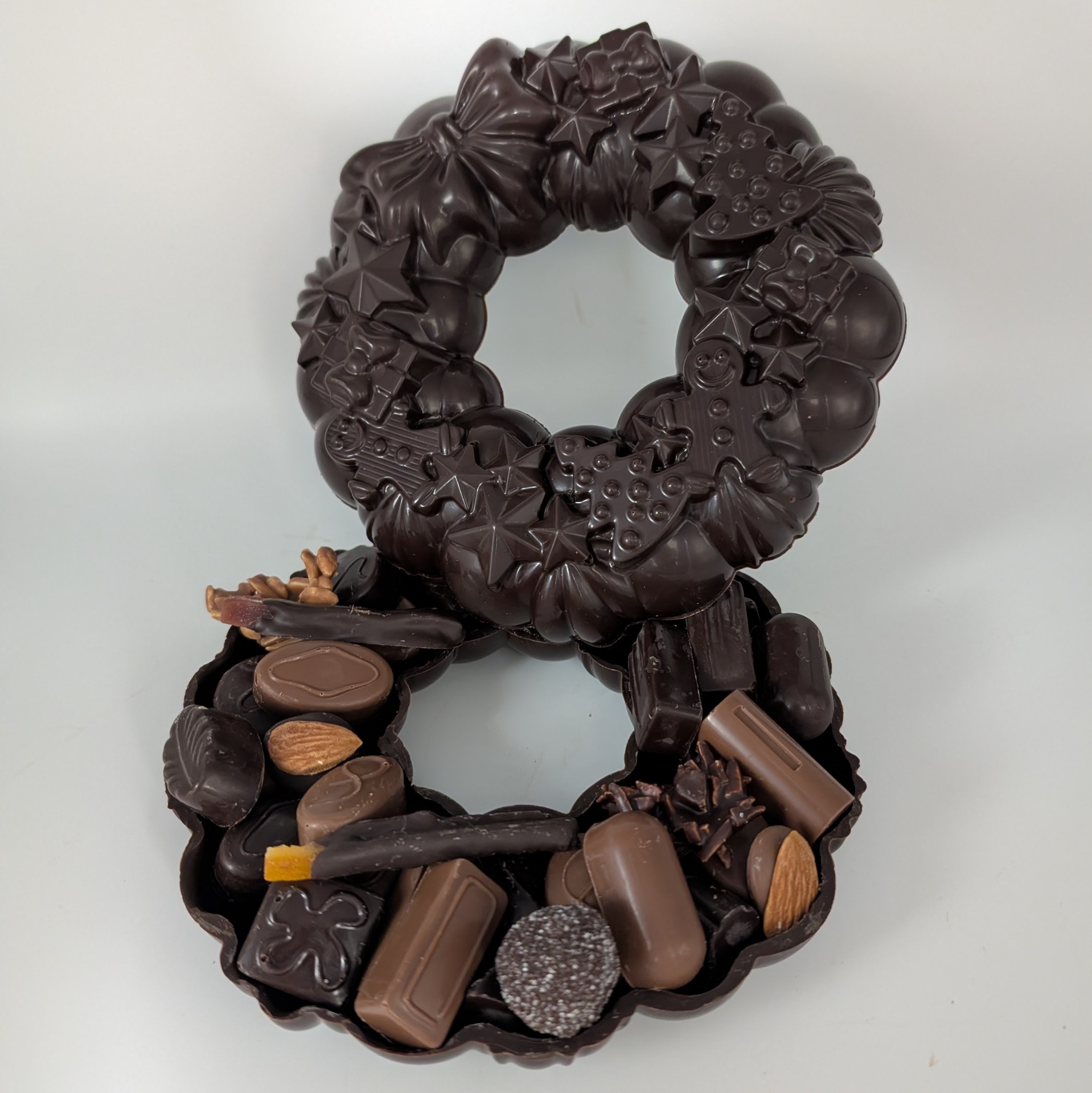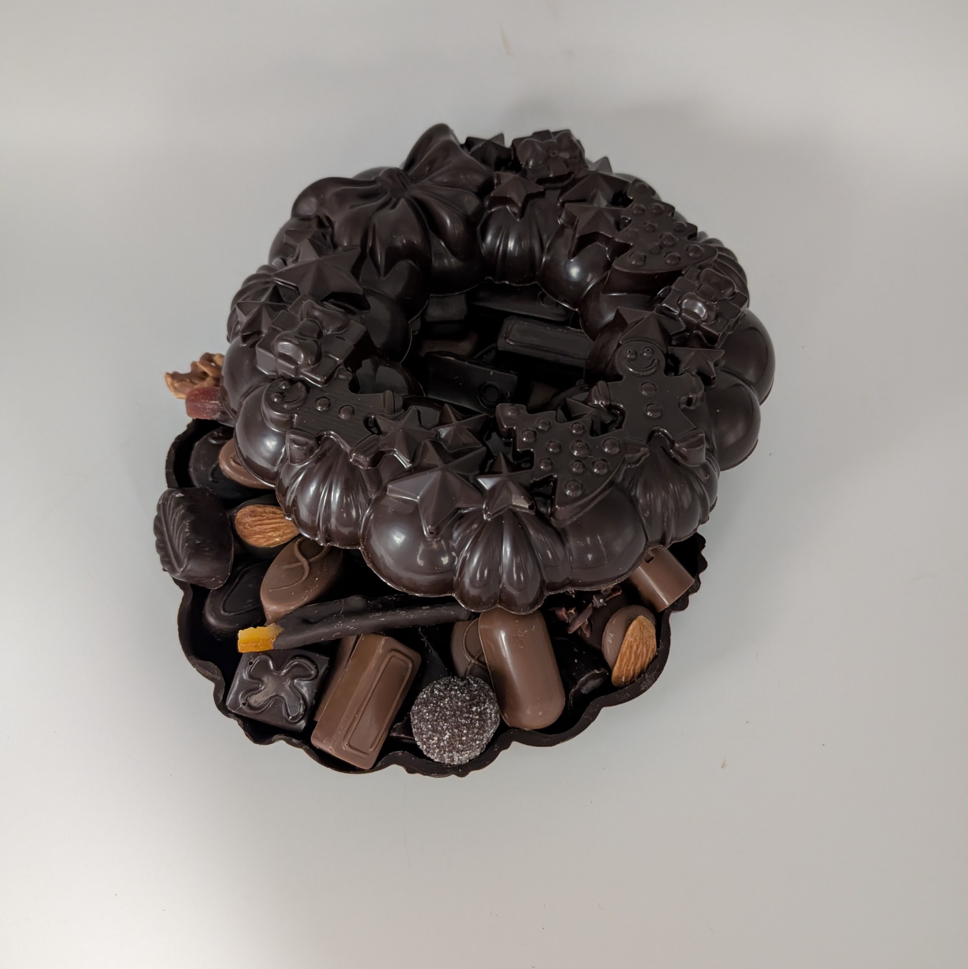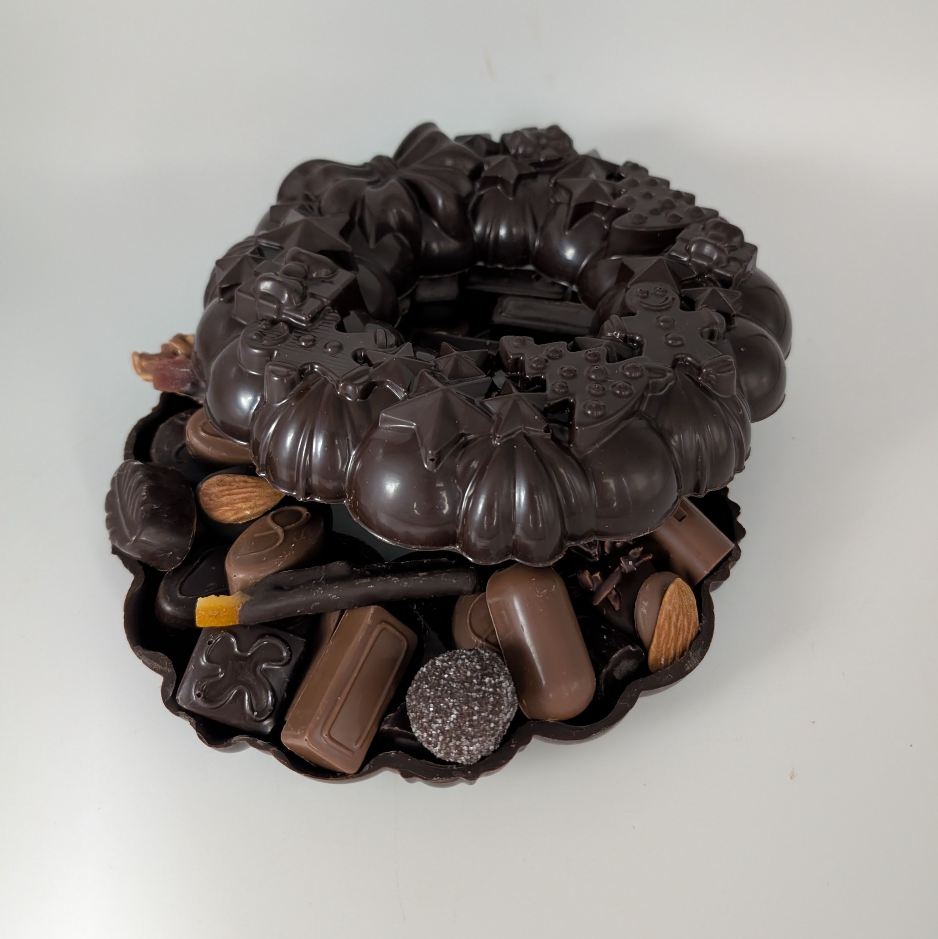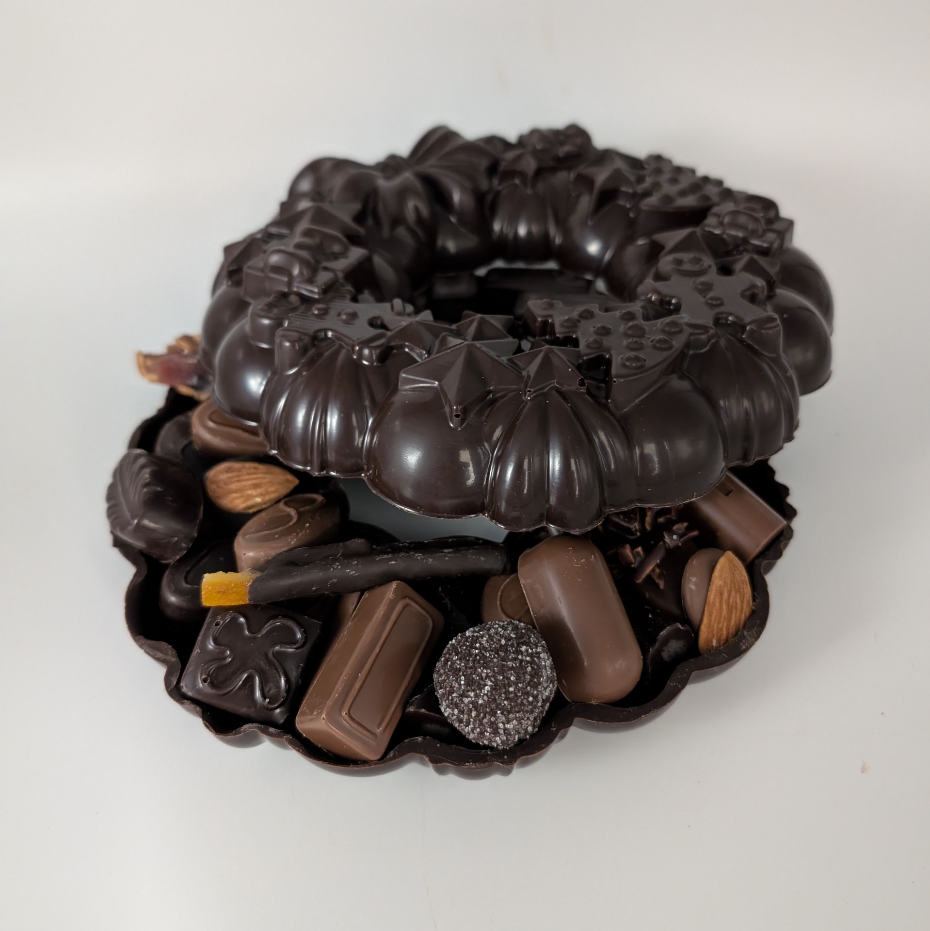 Description : couronne en chocolat noir 70,5% garni d'un assortiment de chocolats fourrés de la collection