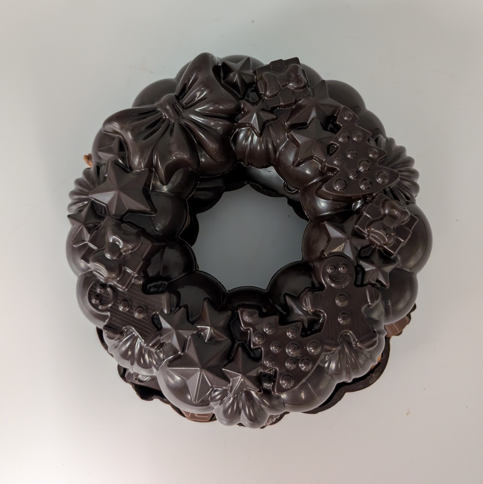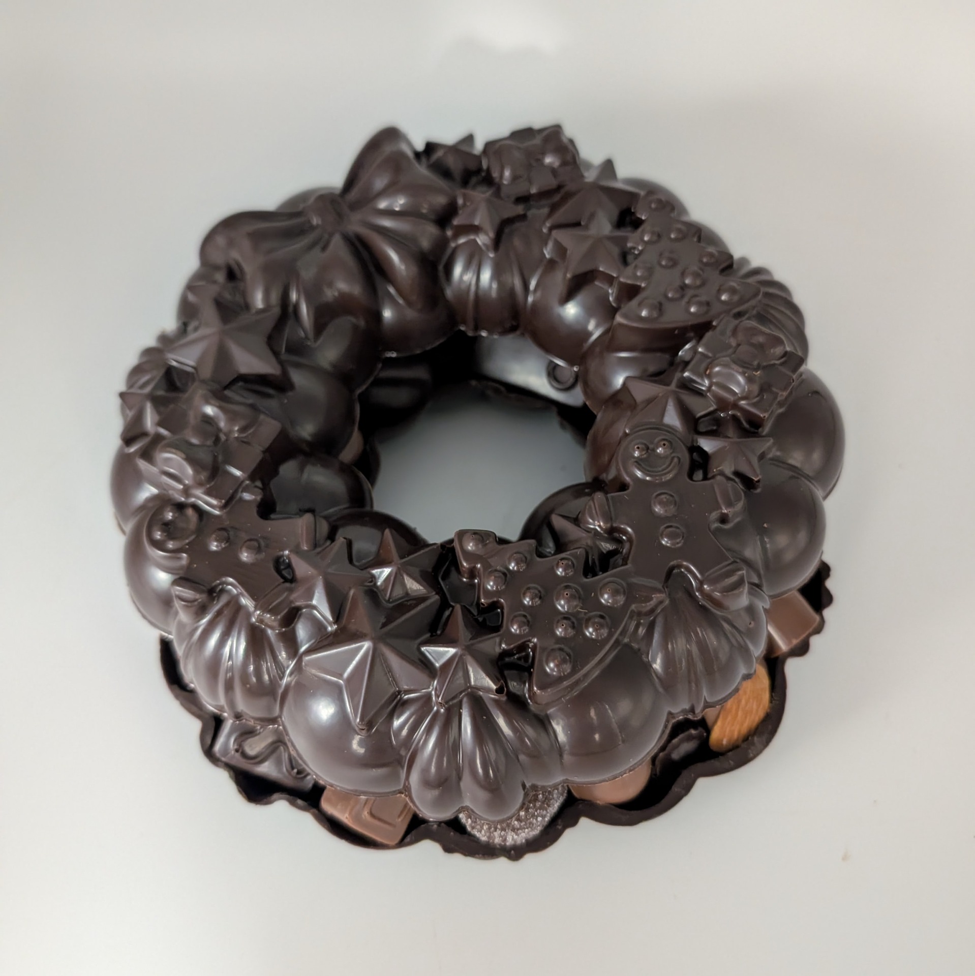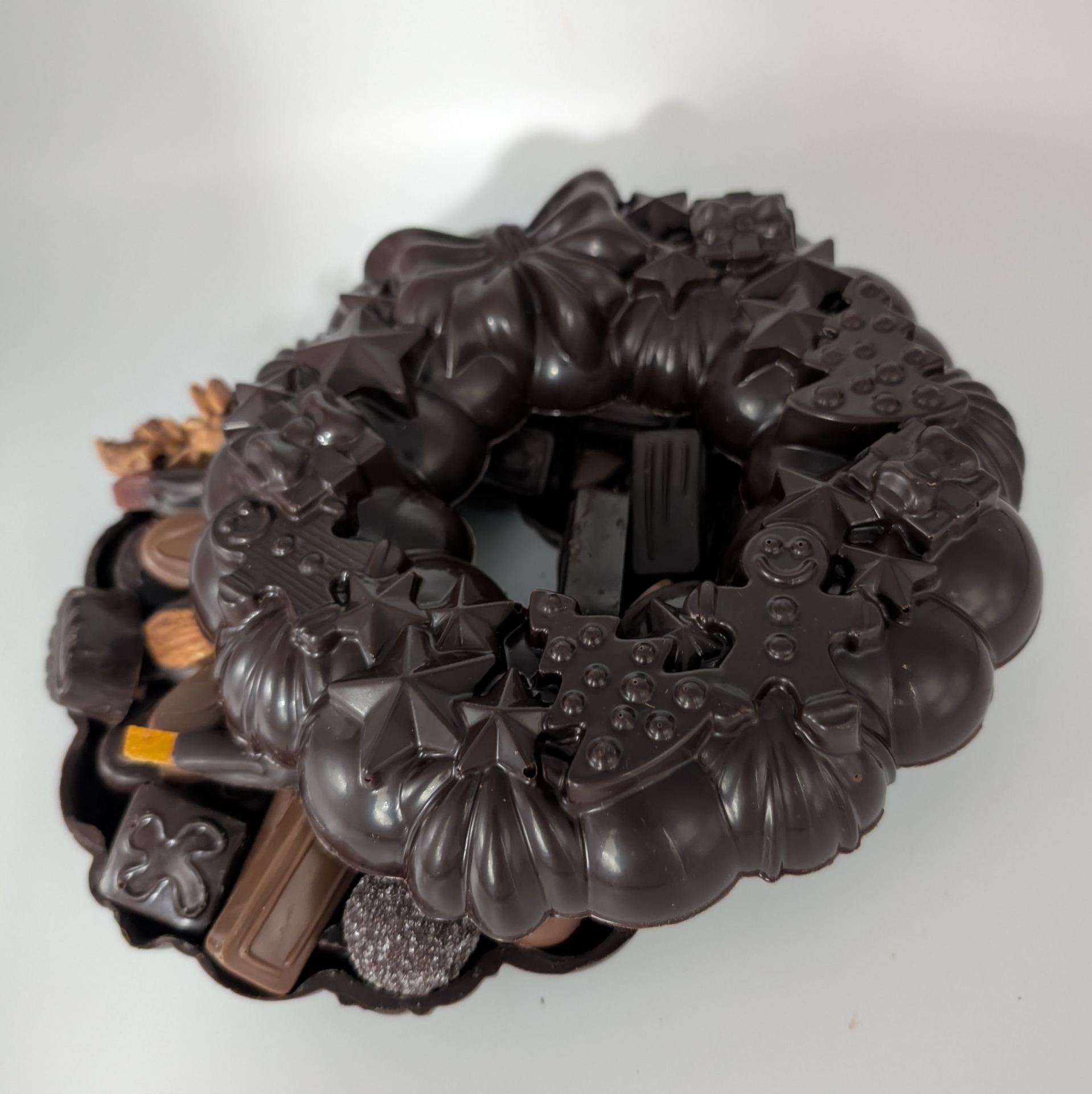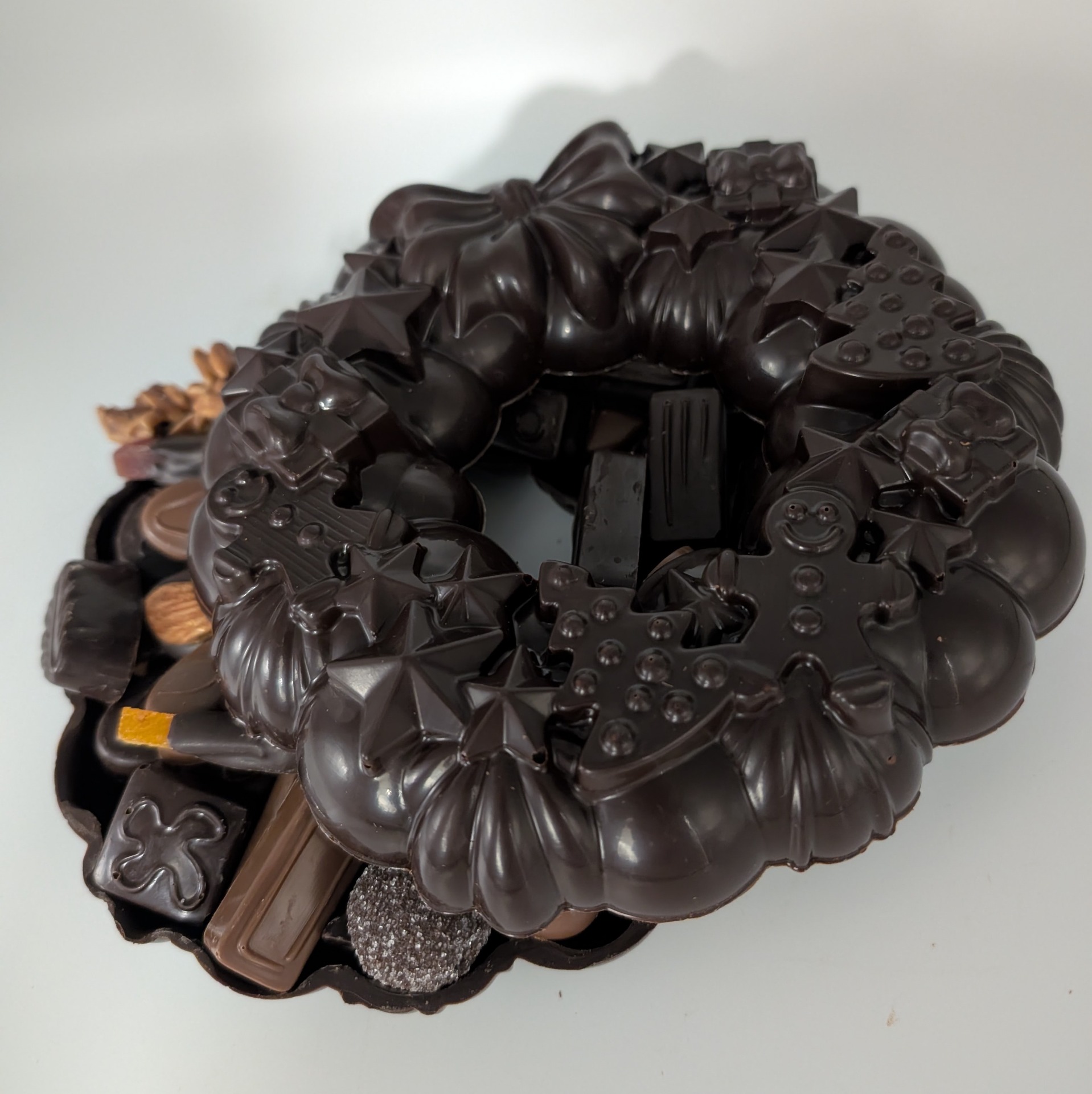 Description : couronne en chocolat noir 70,5% garni d'un assortiment de chocolats fourrés de la collection