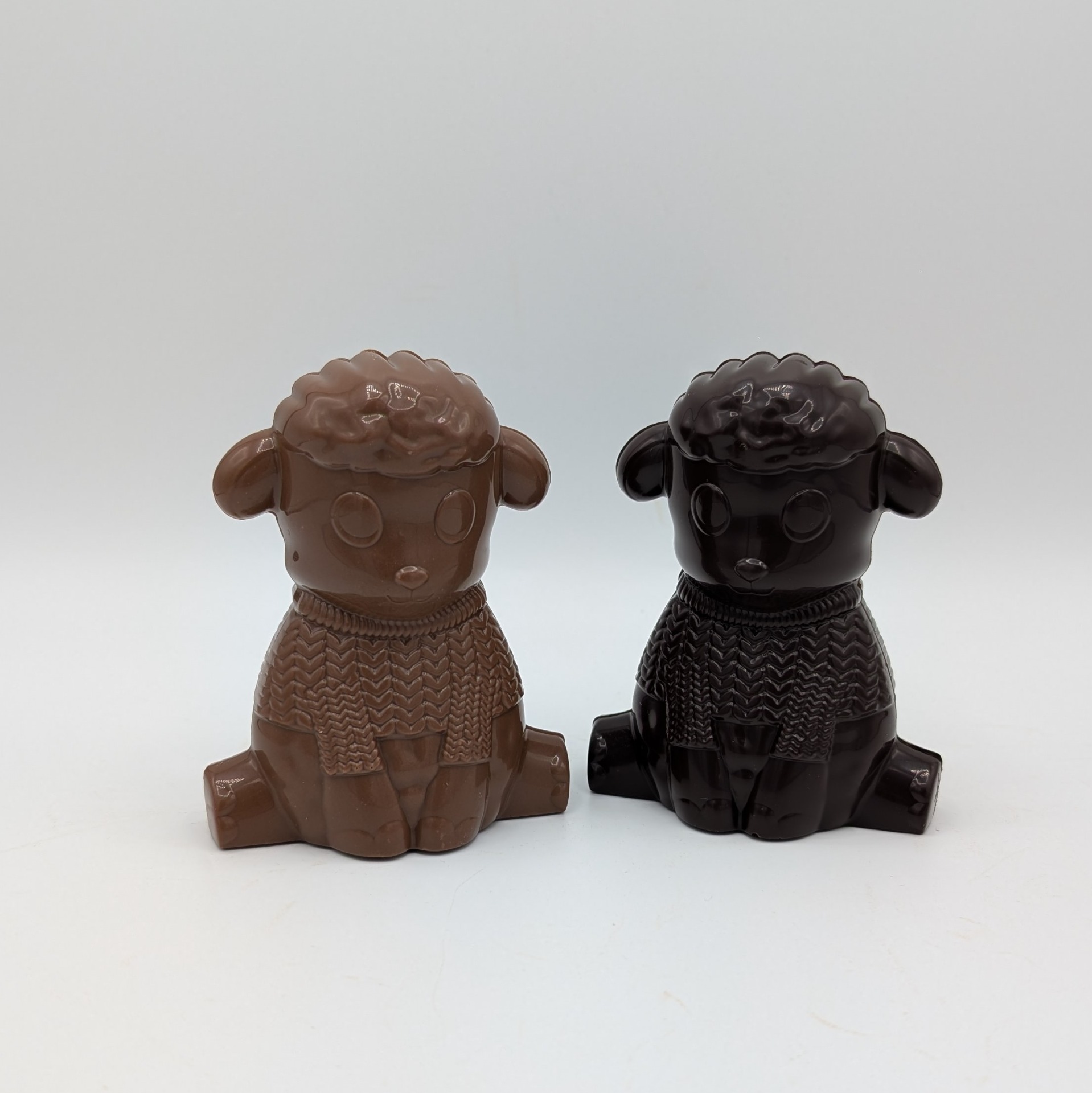 Description : sujet de chocolat brut au lait ou noir en forme de mouton garni de friture de la même couleur