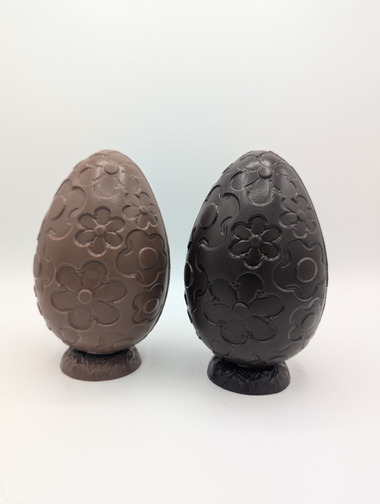 Description : moulage de chocolat brut en forme d'oeuf, garni de friture de la même couleur