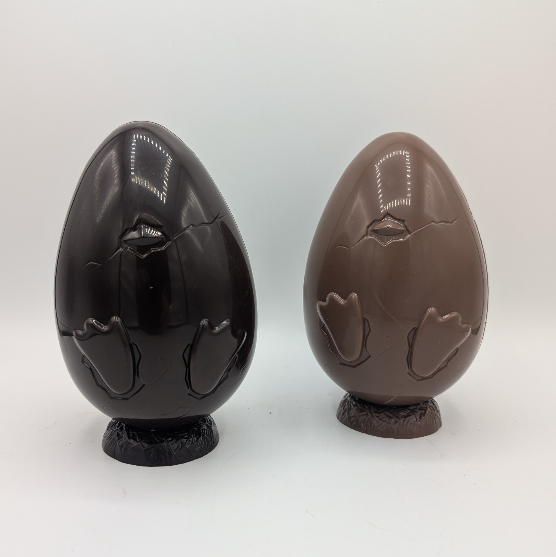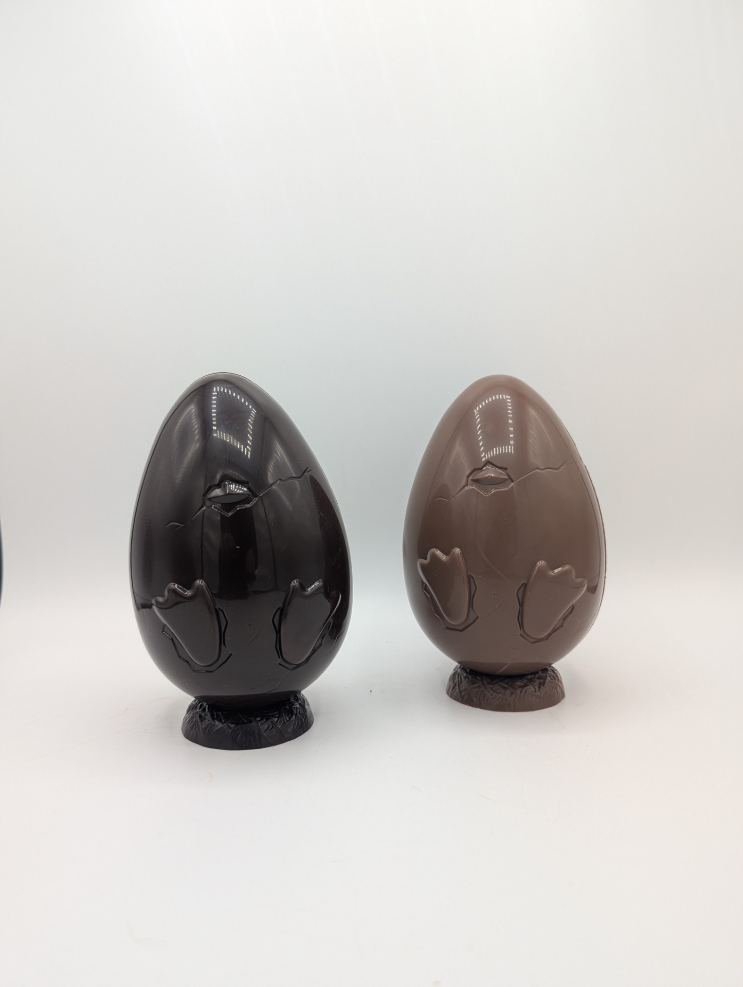 Description : moulage de chocolat brut en forme d'oeuf, garni de friture de la même couleur