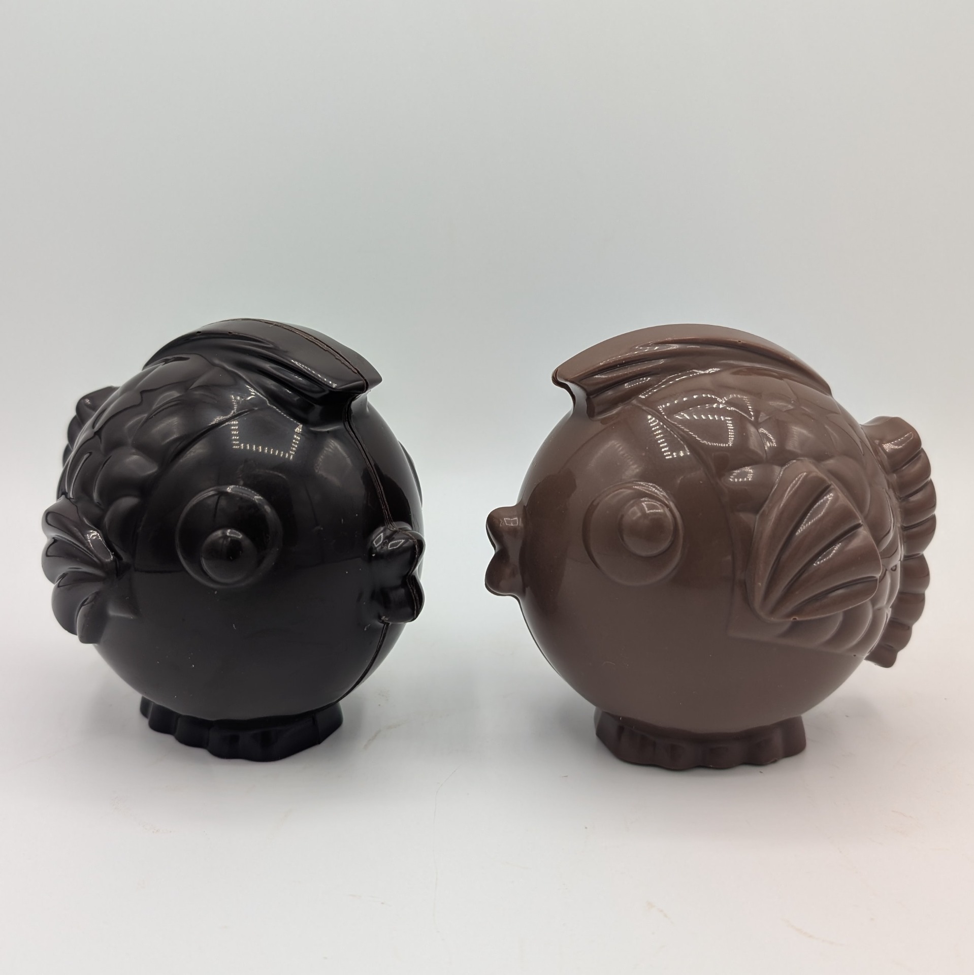 Description : sujet de chocolat brut au lait ou noir en forme de poisson garni de friture de la même couleur