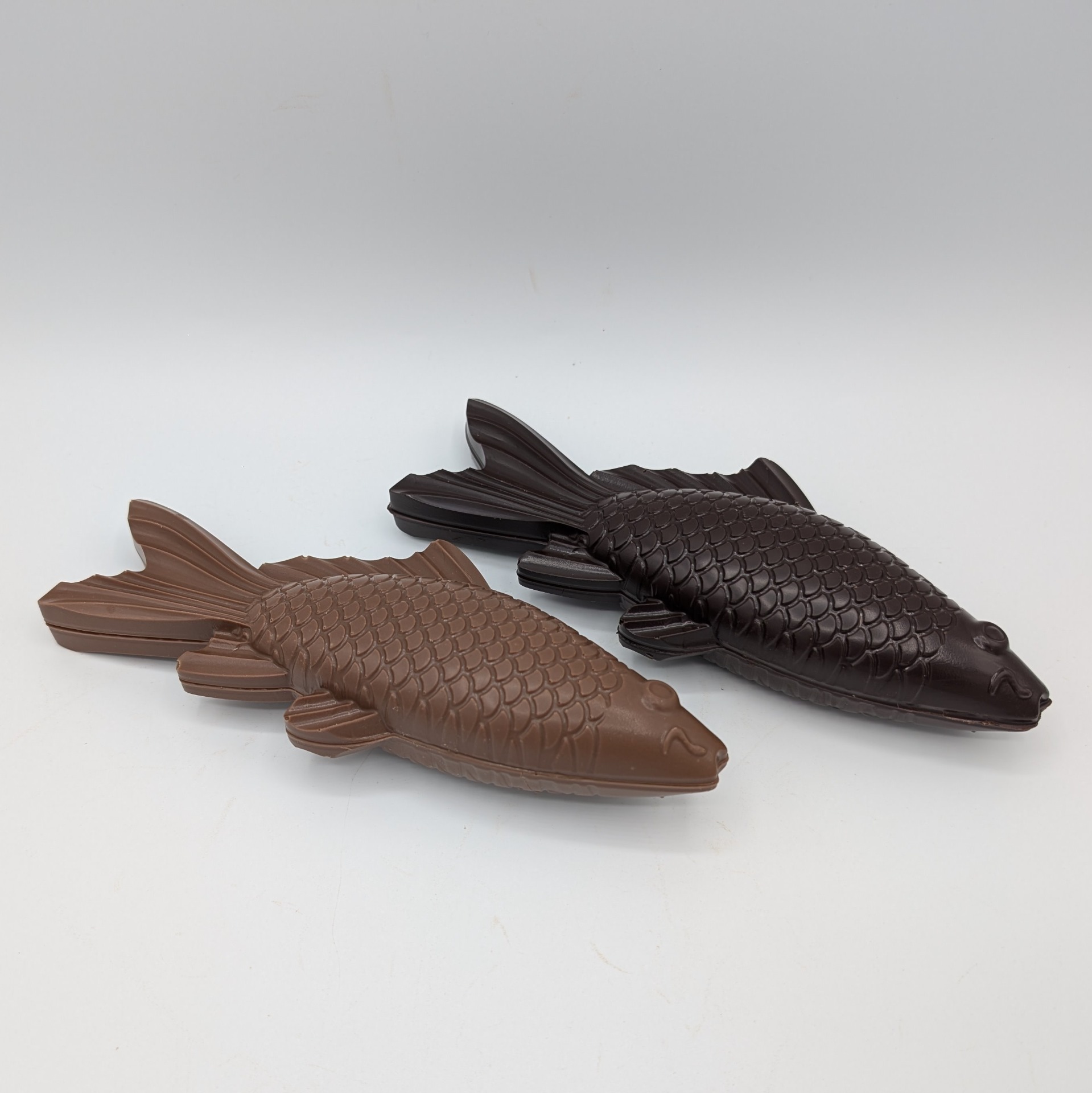 Description : sujet de chocolat brut au lait ou noir en forme de poisson garni de friture de la même couleur