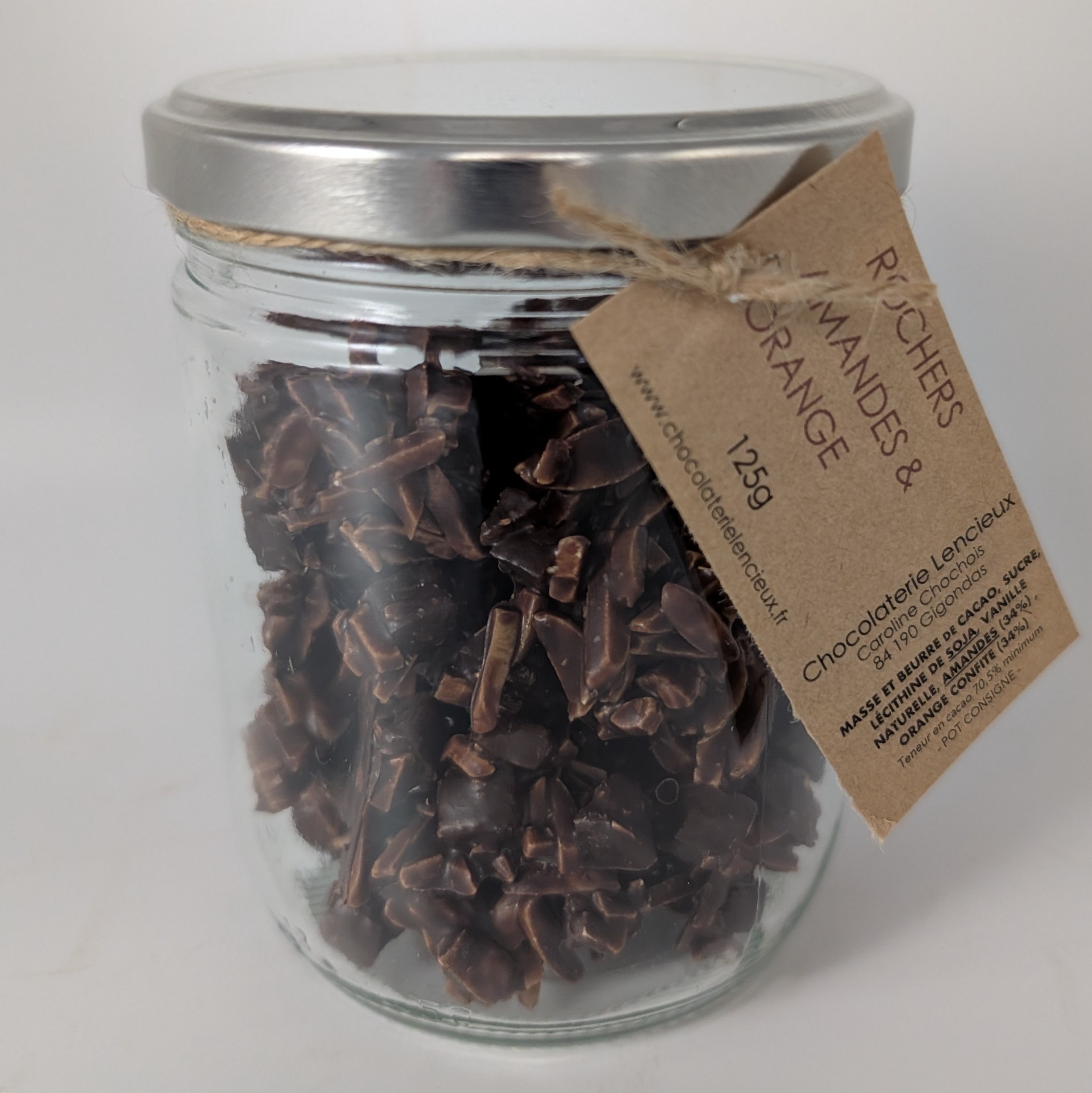 Description : petits rochers au chocolat noir 70,5 % avec bâtonnets d'amandes et orange confite