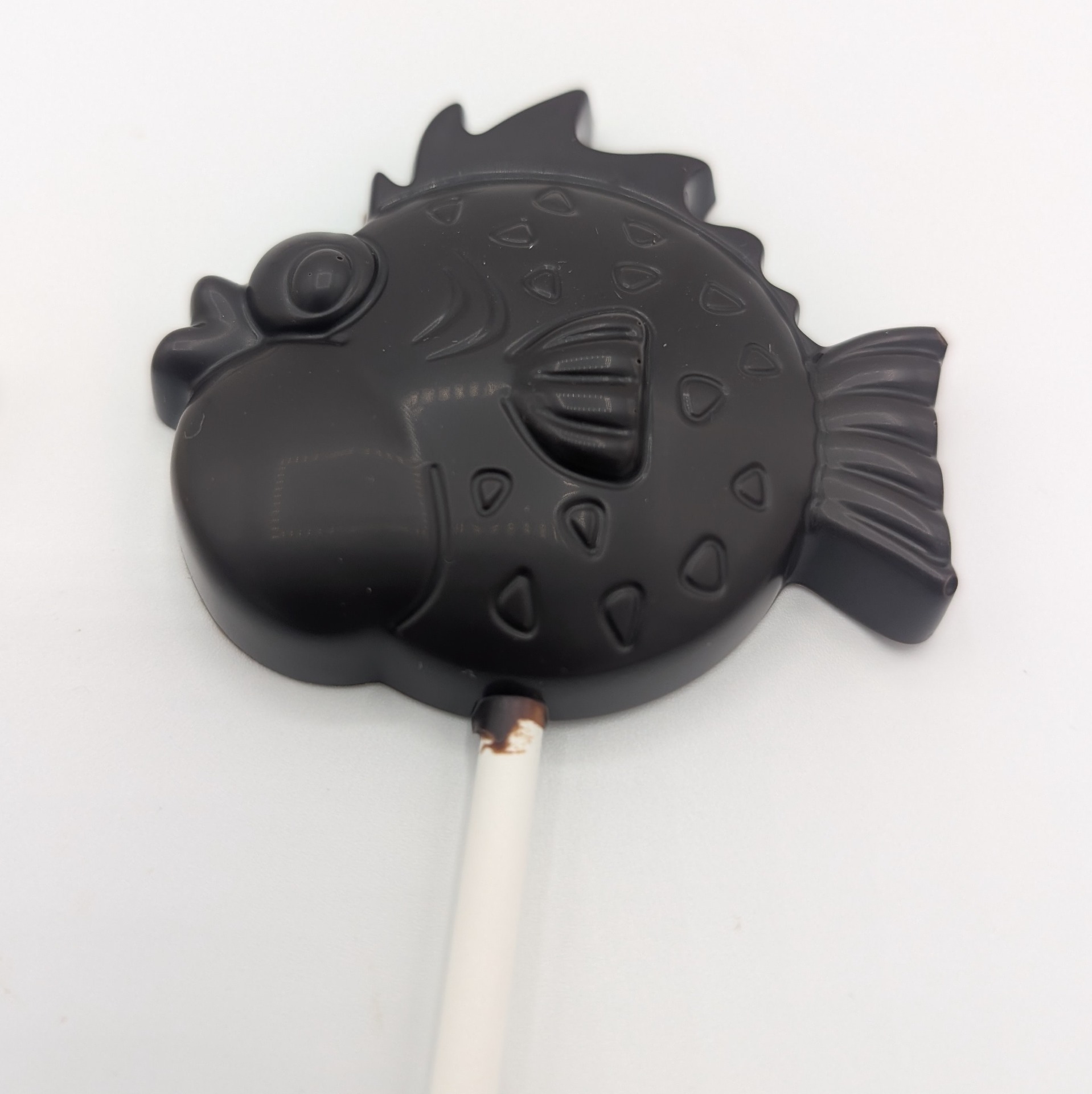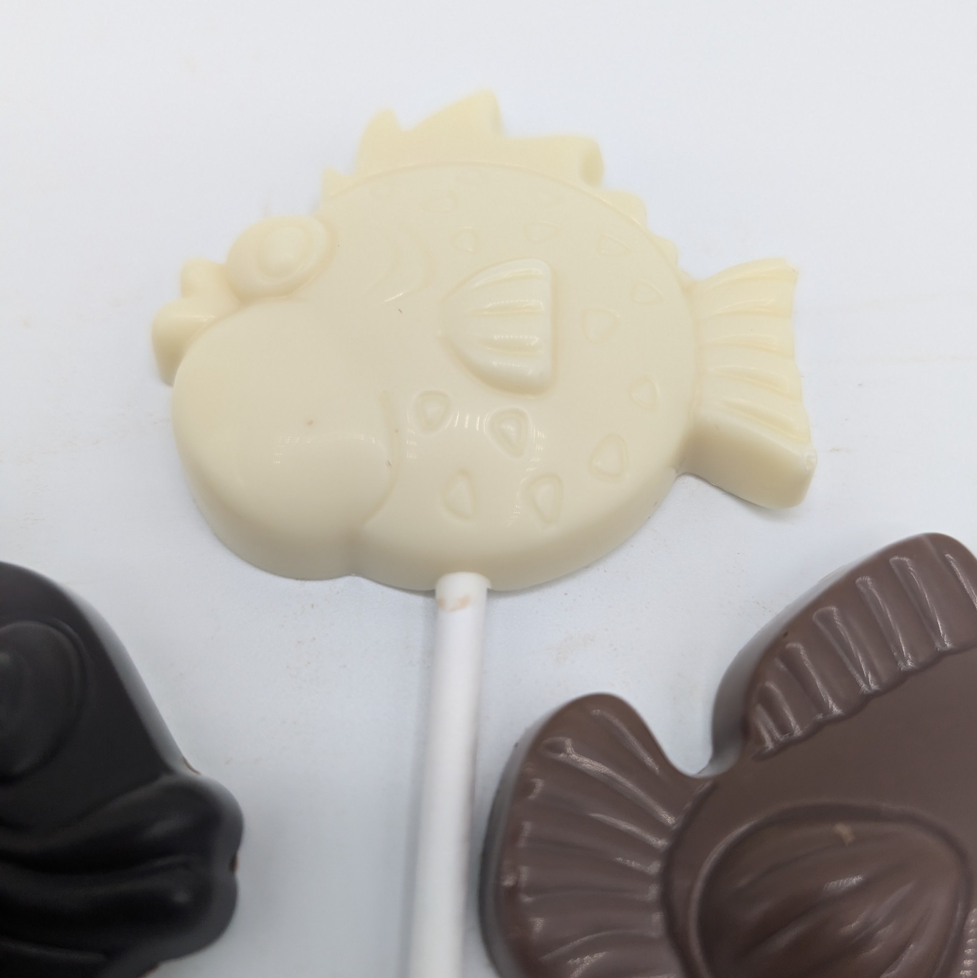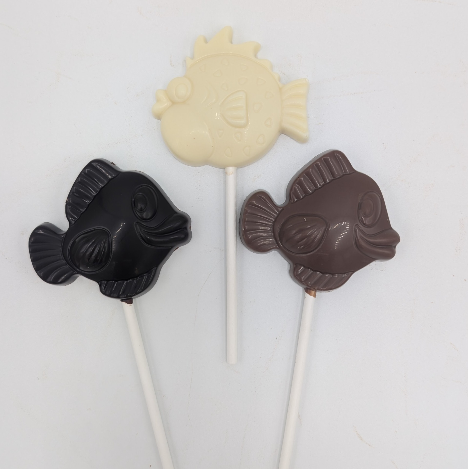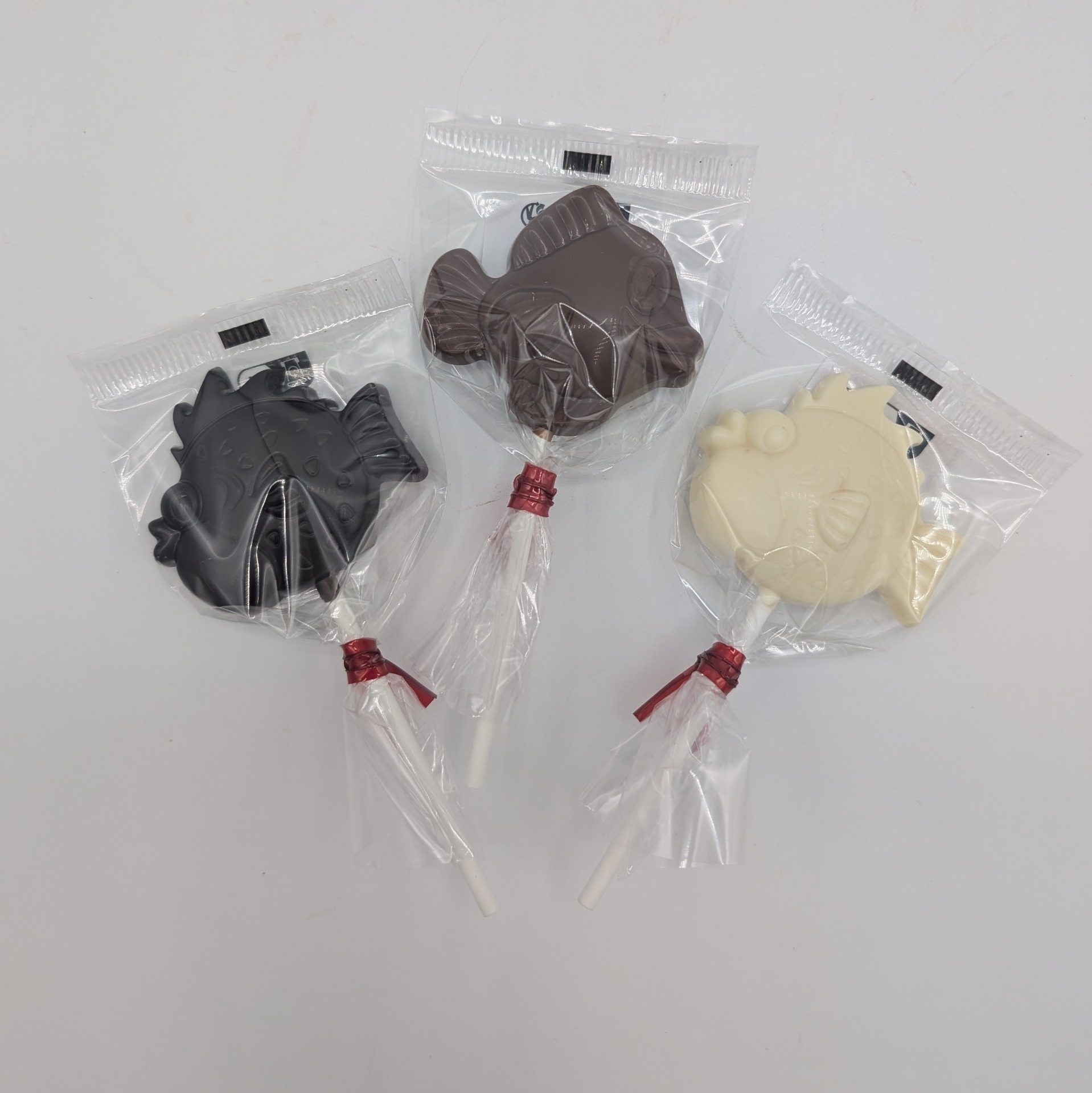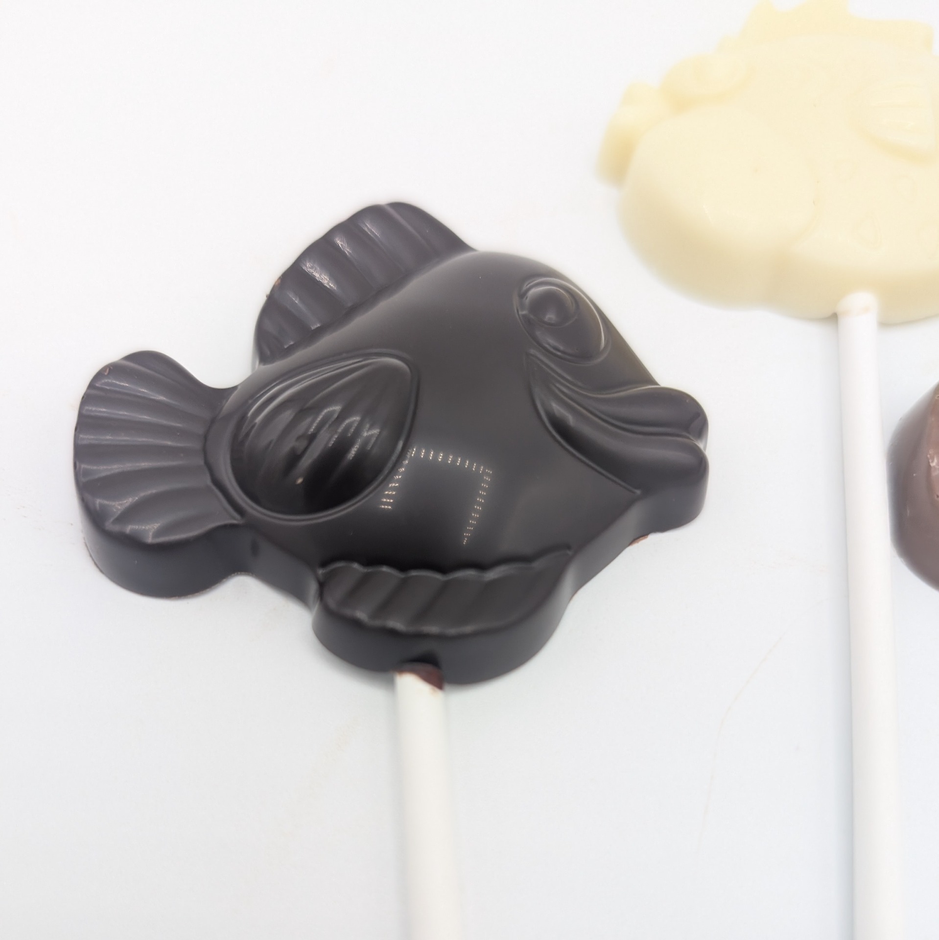 Description : sucette en chocolat en forme de poisson (noir, lait ou blanc)