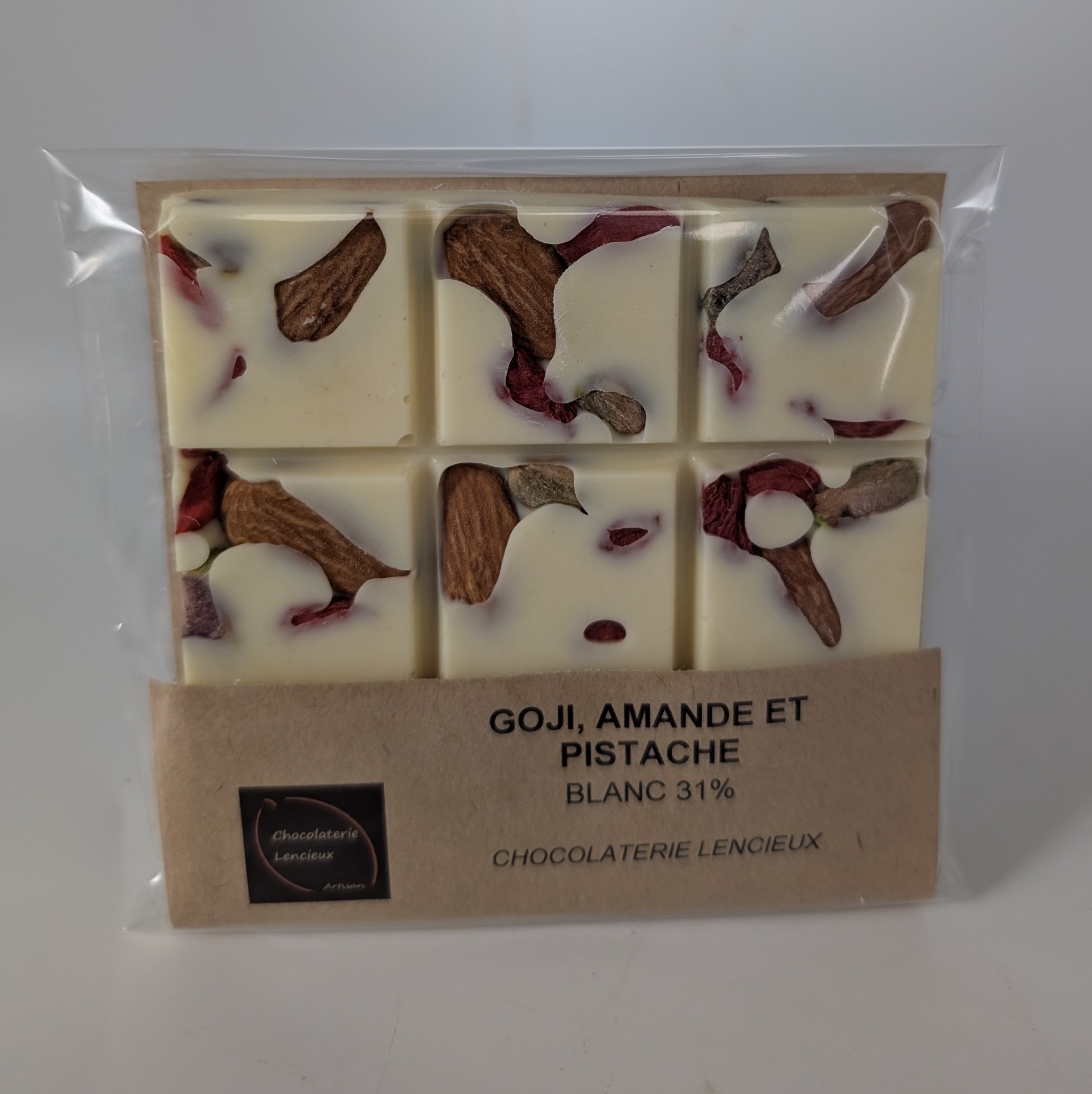 Description : tablette de chocolat blanc 31% avec amandes, baies de goji et pistaches